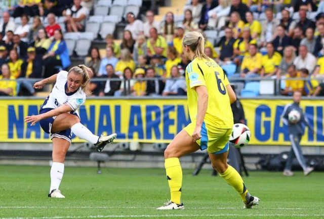 Johanna Rytting Kaneryd kemudian melepaskan tendangan melengkung melebar semenit kemudian akibat kesalahan Jess Carter, saat Swedia mulai menyamakan kedudukan meski tidak ada terobosan bagi tim bawah di babak pertama yang berakhir tanpa gol.