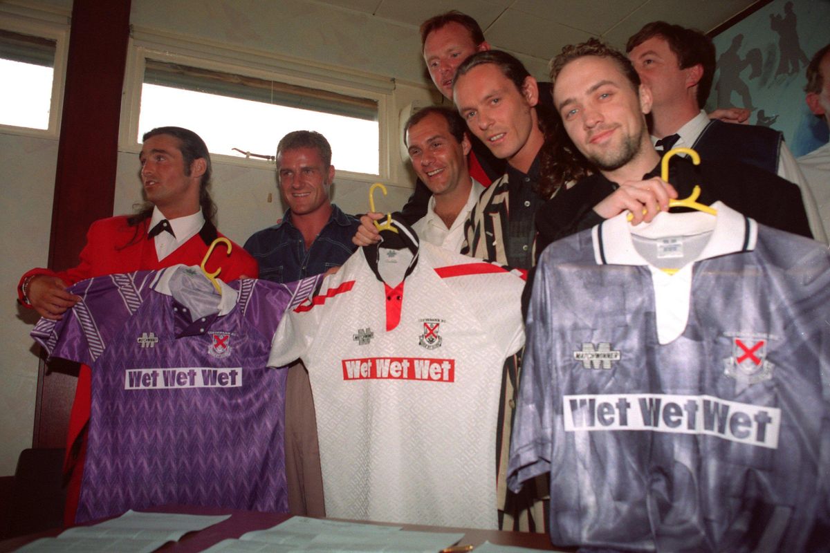 Anggota Wet Wet Wet berpose dengan kemeja Clydebank, diproduksi oleh Matchwinner, setelah menyetujui kesepakatan sponsorship dengan klub, 1993 (Kredit gambar: Alamy)