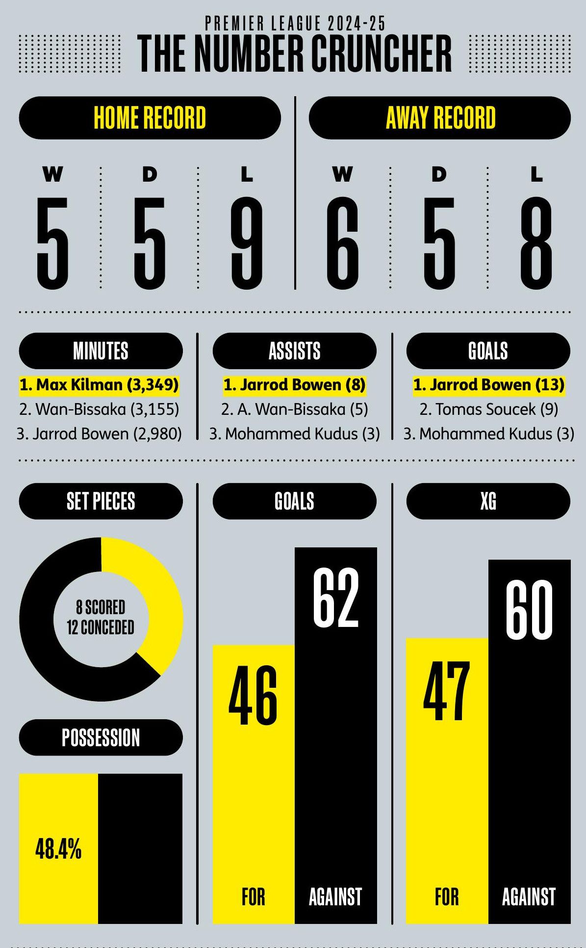Termenung. Paruh kedua dari semester terakhir begitu melemahkan sehingga banyak palu untuk musim pandemi yang ditegakkan. Akankah dewan menunjuk pengganti yang sesuai jika malaise terus? Di sisi positifnya, musim pertama Aaron Wan-Bissaka membawa 66 intersepsi setinggi liga, pemahaman telepati dengan Bowen di sisi kanan, dan penghargaan Hammer of the Year.